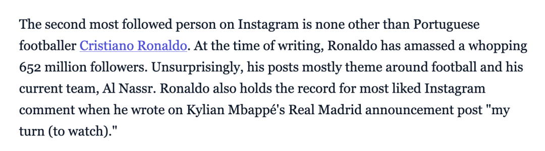 他还保持着Instagram史上评论点赞数最高的纪录——在基利安·姆巴佩(Kylian Mbappé)宣布加盟皇家马德里(Real Madrid)的动态下,C罗仅用一句“轮到我(看了)”引发全球点赞狂潮。