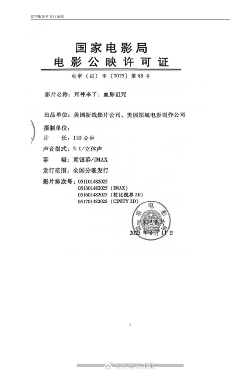 据灯塔专业版,《死神来了:血脉诅咒》发行通知、公映许可证出炉,影片时长110分钟。