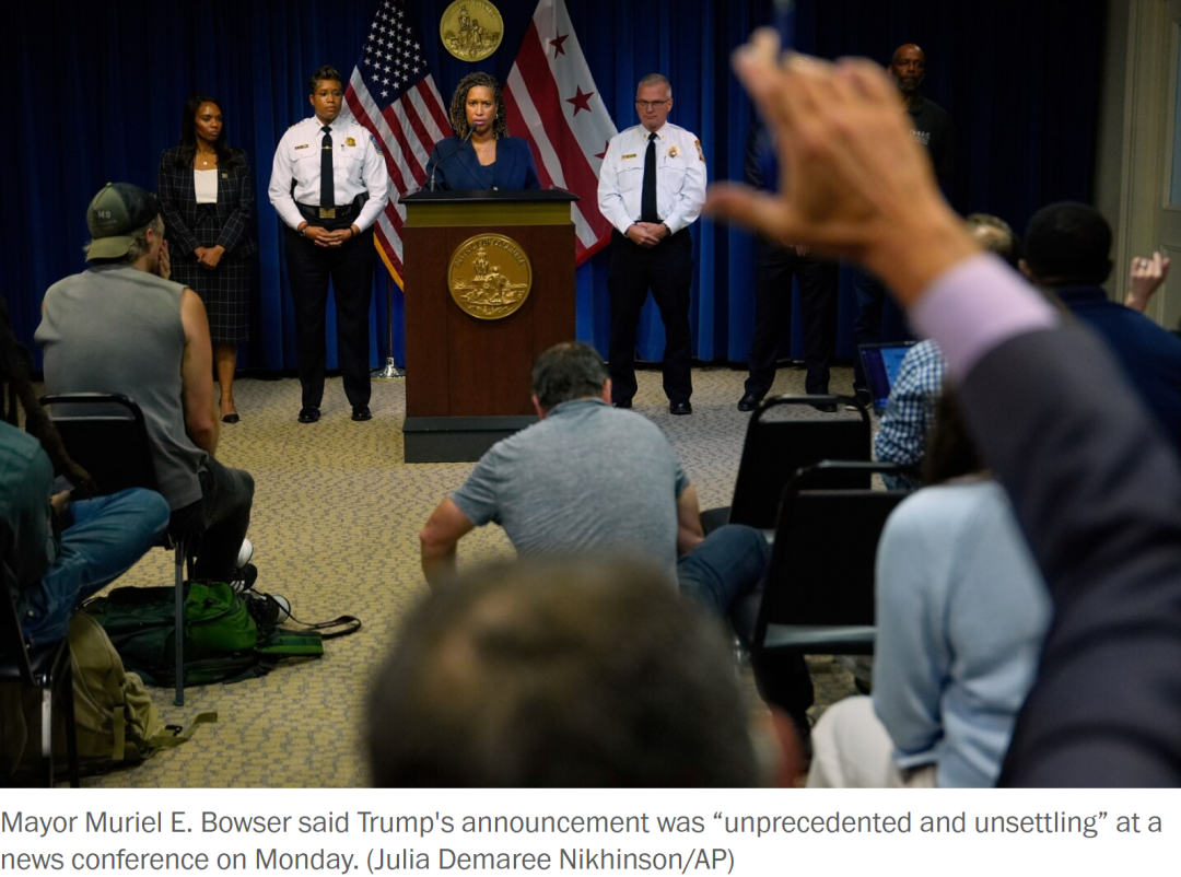 在长达78分钟的新闻发布会上,特朗普将华盛顿描绘为“被暴力帮派、嗜血罪犯、流窜的青少年、吸毒的疯子和无家可归者占领的城市”。他声称要“夺回首都”,要求流浪者“立即搬走”,安置点将设在远离市区的地方;罪犯则会被送进监狱。