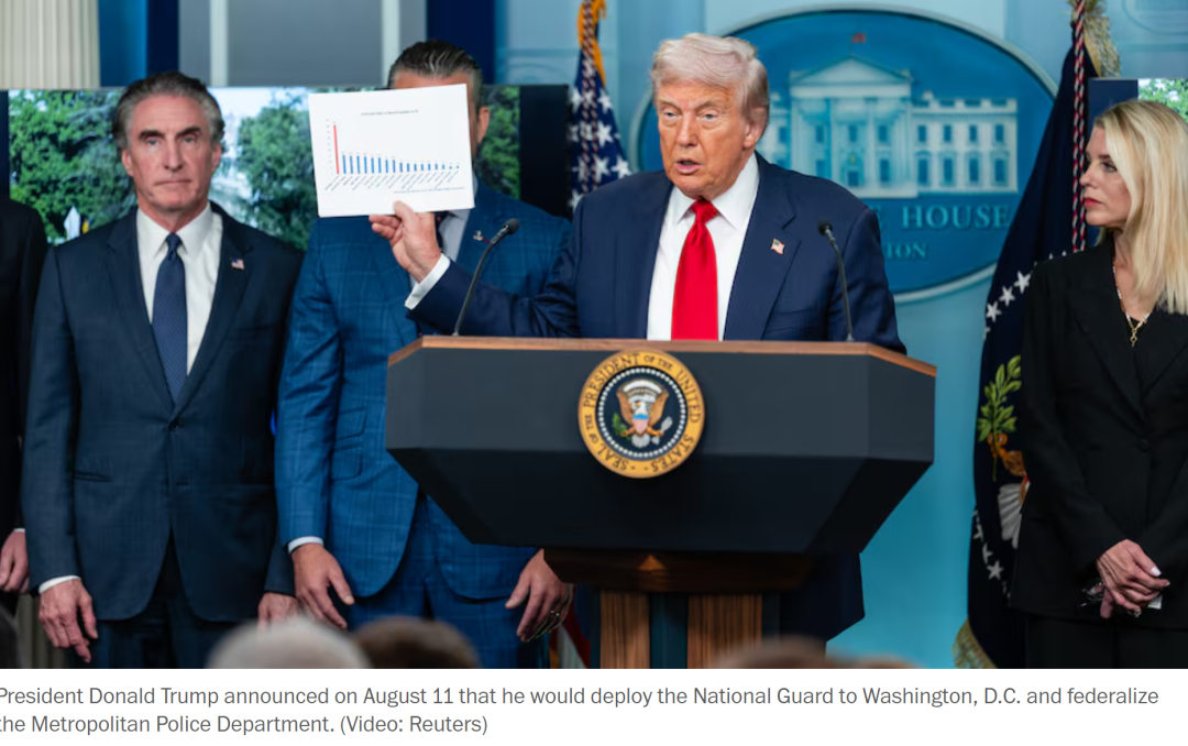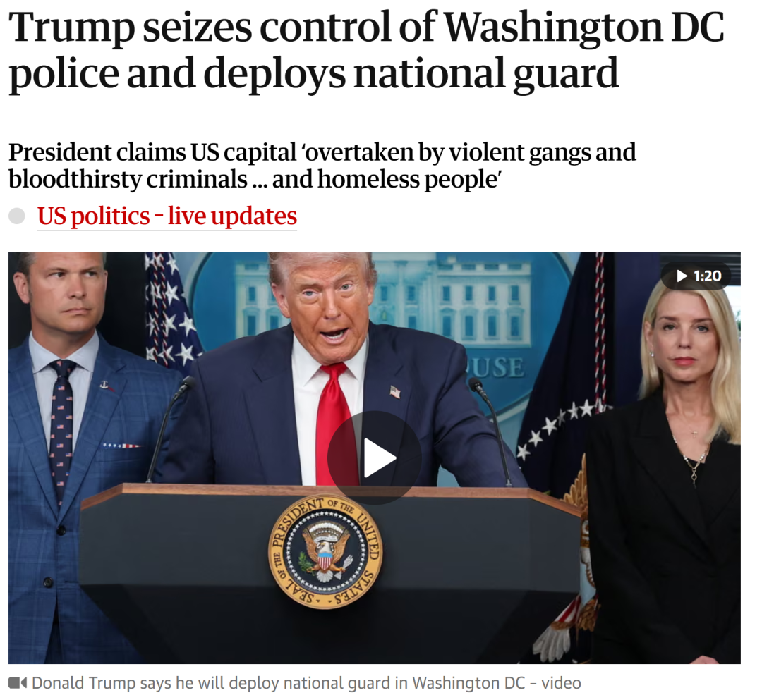 今年7月底,韩国前总统尹锡悦因2024年12月深夜宣布全国戒严、调动军队封锁国会,被指“史无前例干预地方事务”,最终在国会二次弹劾中下台,并于7月31日遭羁押审判。不到两周后,8月11日,美国总统特朗普在大洋彼岸上演了另一幕高调“治安接管”——宣布华盛顿特区进入公共安全紧急状态,直接接管首都警察局,并调动国民警卫队进驻,以“夺回首都”为口号重塑治安秩序。