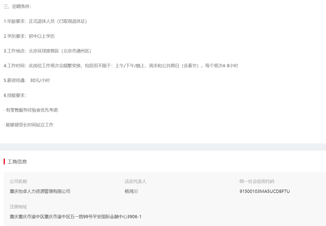 此外,据大河报,记者在中国老年人才网注意到,北京环球影城发布零售服务人员招聘信息。 招聘条件要求为正式退休人员(已取得退休证),拥有初中以上学历,岗位工作班次会频繁变换,每个班次4~8小时,薪资待遇为30元/小时,能够接受长时间站立工作。