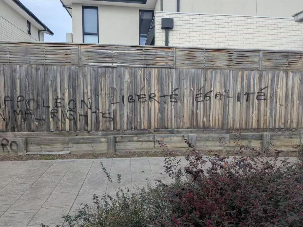 “旁边用喷漆喷了很多字,包含“Karma has no menu”(翻译:种什么因得什么果)当时他震惊,立刻报警处理。”