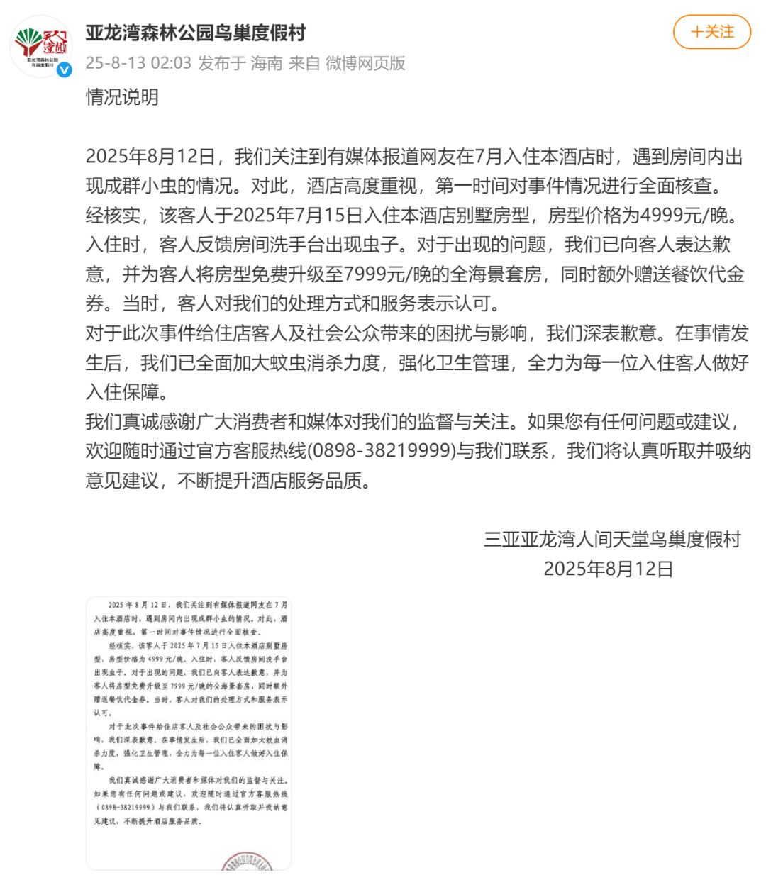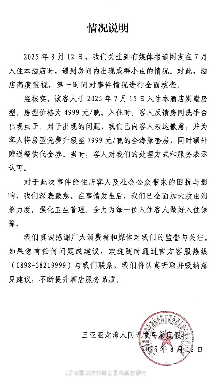 8月13日凌晨,涉事酒店亚龙湾森林公园鸟巢度假村在其官方微博发布情况说明: