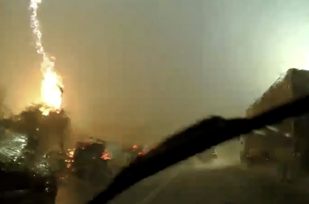 闪电直劈电杆 爆炸火球冲天吞没街道 交通灯全灭 秒变灾难片!