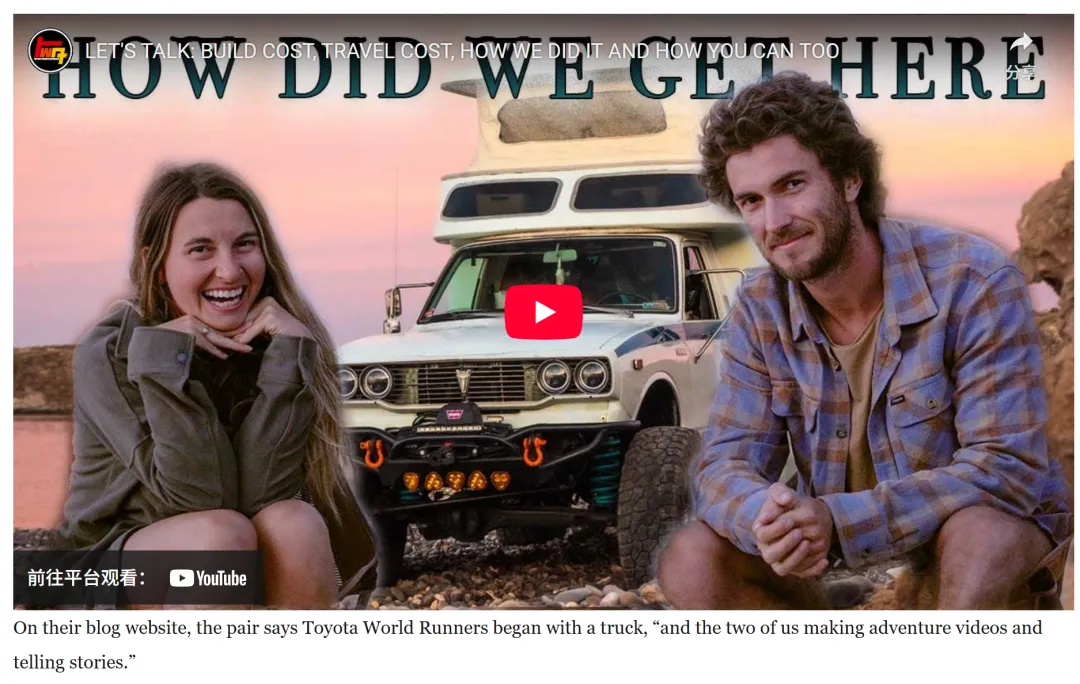 在他们的博客里,这对夫妇写过,Toyota World Runners这个频道始于一辆卡车,“加上我们两个人拍冒险视频讲故事”。他们说:“现在这已经变成了一个大家庭。我们俩都是爱冒险的人,想要好好过日子。对我们来说,这就是一场走遍世界的疯狂冒险。”