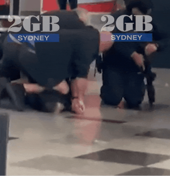 2GB获取的视频画面显示,持枪警员正在制服那名男子,画面中至少有两人将该男子按倒在地,他不断大声喊叫。