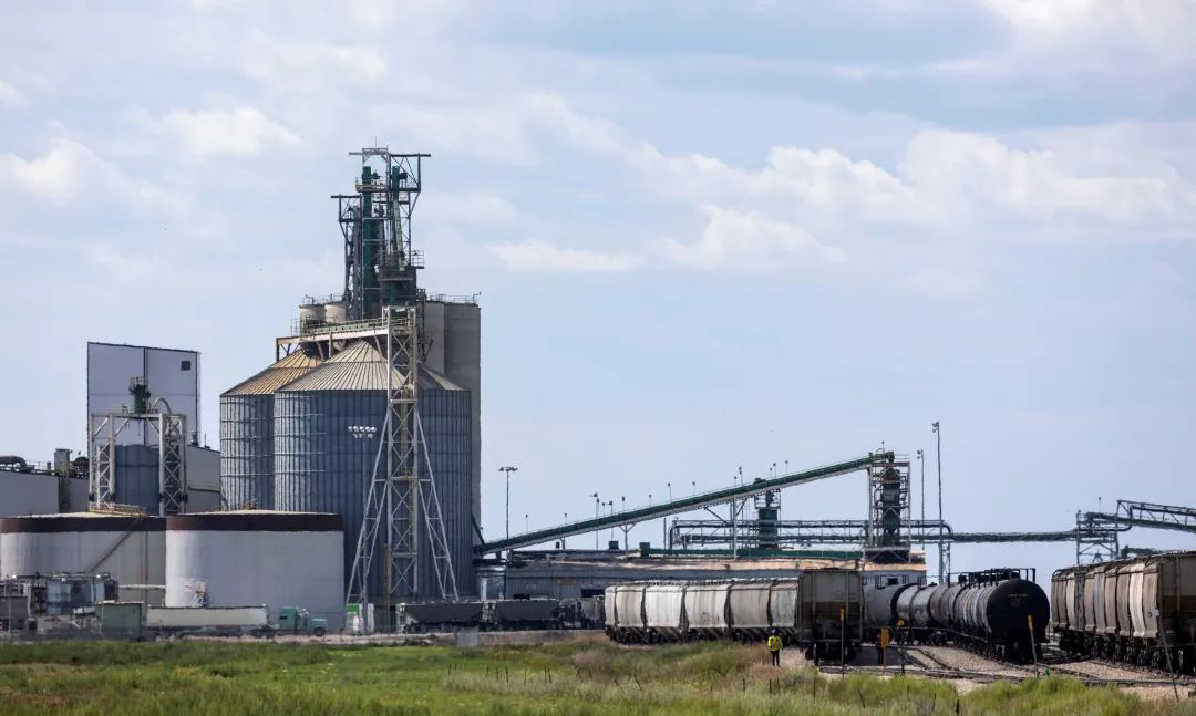 当地时间2025年8月12日,加拿大萨斯喀彻温省,运输油菜籽的铁路车厢停靠在油菜籽压榨厂