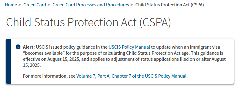 8月8日,美国公民及移民服务局(USCIS)宣布,将对《儿童身份保护法》(CSPA)的年龄计算规则进行重大调整——今后统一按“最终裁定日期”(Final Action Dates,排期表 A)来判断子女是否“超龄”,不再允许用“递交申请日期”表(表 B)提前锁定年龄。