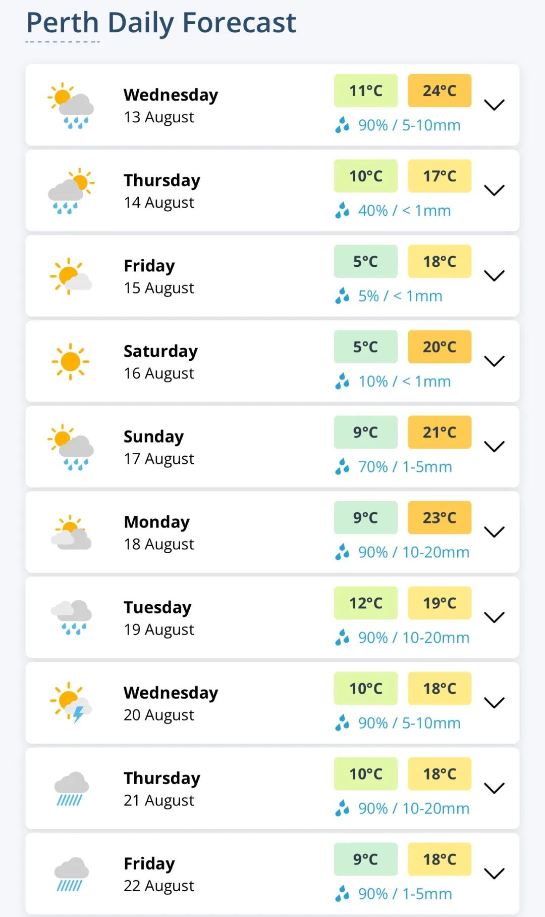 周五(8月15日)早晨寒冷,最低气温仅4℃,白天转晴,最高气温18℃,珀斯东北部可能出现轻雾或霜冻。