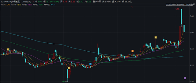 截至8月12日收盘,中国重工股价为5.01元/股。