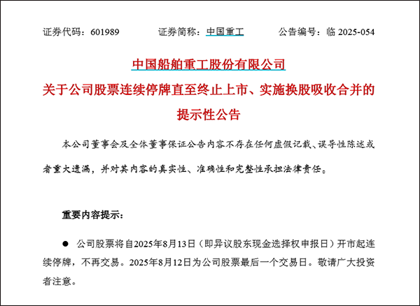 8月11日晚间,中国重工发布《关于公司股票连续停牌直至终止上市、实施换股吸收合并的提示性公告》,公告显示,公司股票将自2025年8月13日(即异议股东现金选择权申报日)开市起连续停牌,不再交易。2025年8月12日为公司股票最后一个交易日。