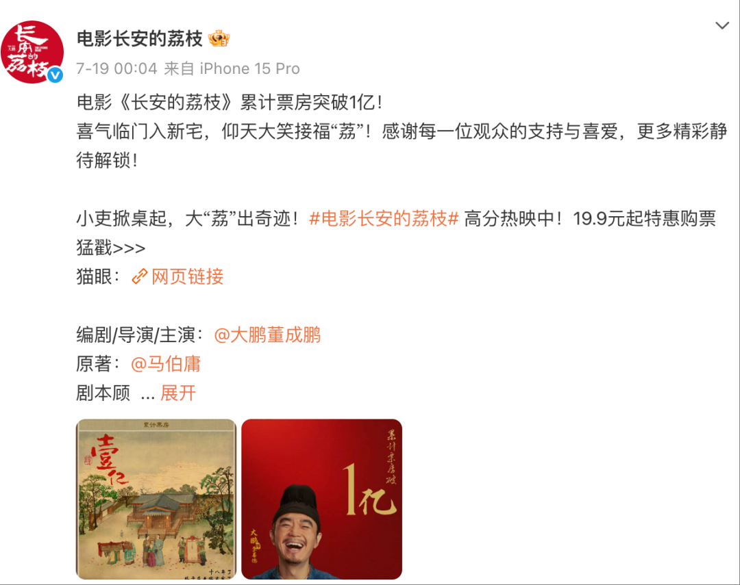 在官方社交平台,《长安的荔枝》采用了两种形式:以主体为红色的单人海报作为破亿海报,同时还有一版是类似连环画式的故事剧情展示,仿佛在电影之外,继续助力李善德将荔枝送到长安。