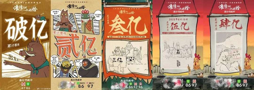 单看官方发布的票房海报,前两张更接近传统四格漫画风格;到了3亿海报,画风突变为手绘风格;后续风格再度微调,公鸡画师正式“晋升”为官方画手,成为海报画框外的常驻角色。