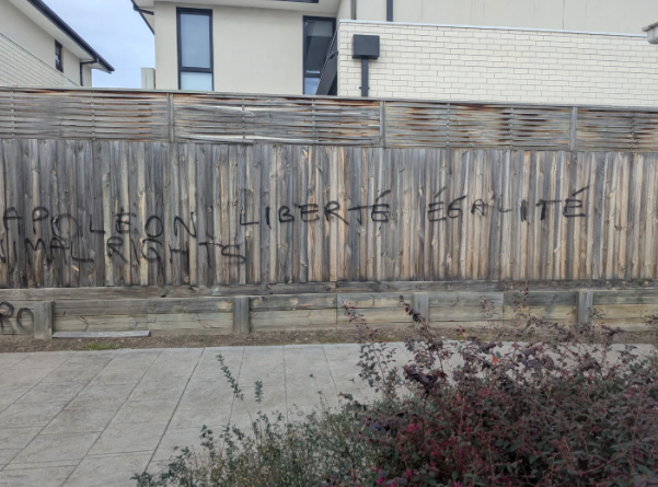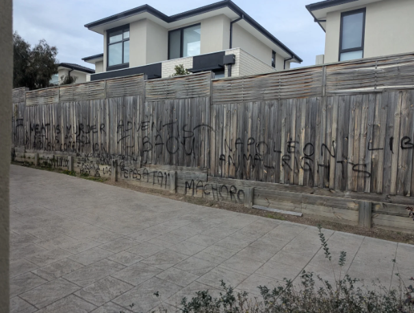 现场发现,屋外的墙面布满了涂鸦,包括“karma”(报应)、“betrayal”(背叛)和“enough is enough”(够了)等刺眼字句。