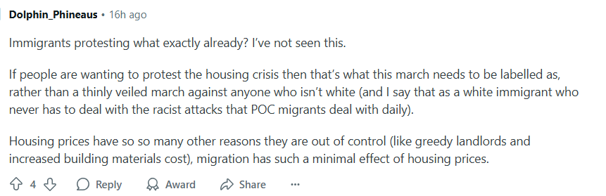 如果人们是想抗议住房危机,那就应该明确把这次游行标成住房危机的抗议,而不是用这种几乎不加掩饰的方式,去针对任何不是白人的人。