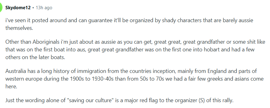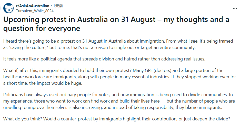 “我听说澳洲将在8月31日举行一场关于移民的抗议活动。从我看到的情况来看,这场活动被包装成是为了“拯救文化”,但在我看来,这并不是针对整个群体的理由。