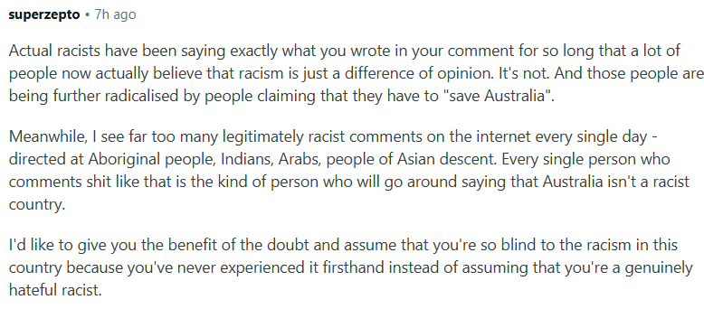 真正的种族主义者早就用你这种说法来洗白自己,所以很多人现在误以为“种族主义只是意见不同”。但事实不是这样,那些喊着要“拯救澳洲”的人,其实是在煽动更多人变得极端。