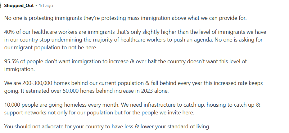 没有人是在抗议移民本身,他们抗议的是超过我们承受能力的大规模移民。