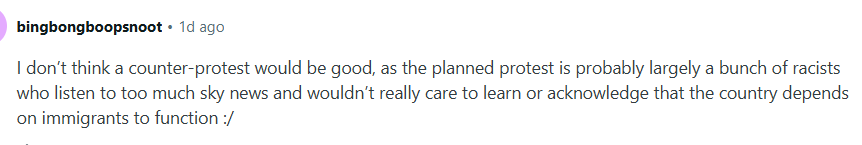 我觉得举行反抗议活动并不好,因为这场计划中的抗议大概率就是一群看太多 Sky News 的种族主义者,他们根本不会想去了解、也不会承认这个国家的运转是依赖移民的。