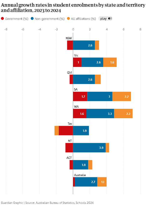 具体来看,2024年,公立中学学生仅增加约9700人(不到1%),私立中学却增加了足足2万5千多人,增幅达到3.3%。