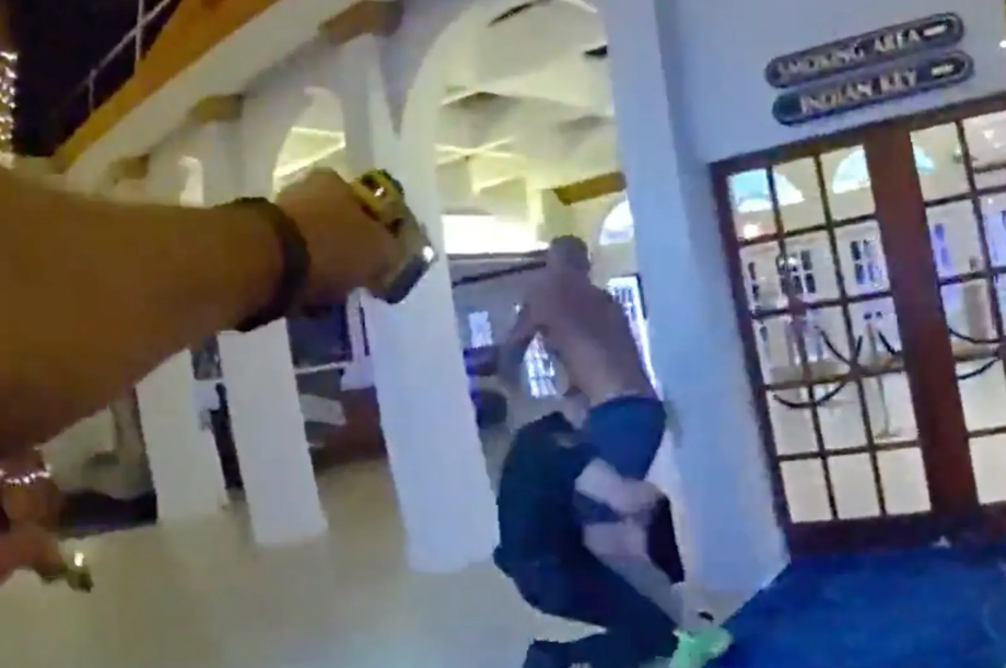 视频显示,警员捡起掉落在地上的电击枪,命令法辛“立即把手放到背后”,但法辛并未服从,而是试图绕过柱子逃跑。警员随即发射电击枪,另一名警员将他扑倒在地并成功铐上手铐。