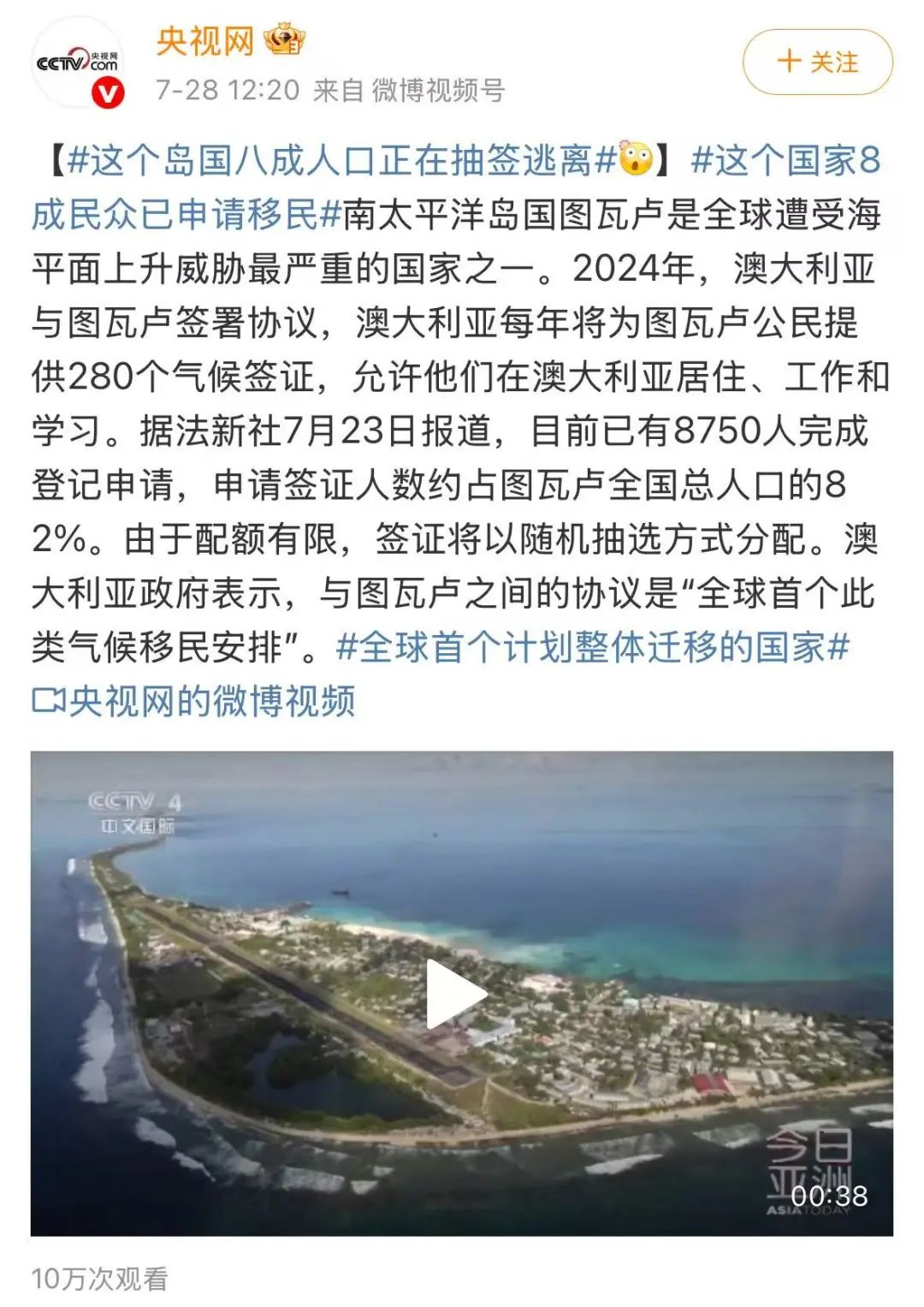 今年6月16日至7月18日,图瓦卢移民至澳大利亚的“气候签证”开放申请,首批280人已通过抽签选出。而背后,共有2474个家庭组、8750人参与了报名,意味着图瓦卢全国82%的人口都参与了抽签。