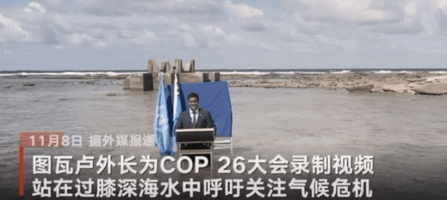 2021年,第26届联合国气候变化大会(COP26)上的一段视频中,图瓦卢的外交部长在西蒙·科菲(Simon Kofe)正身着西装演讲。人们本以为他站在常规的演播厅,突然镜头缓缓拉远,海浪冲来,原来他的双腿早已被浸湿,他正站在齐膝深的海水中发表演讲。