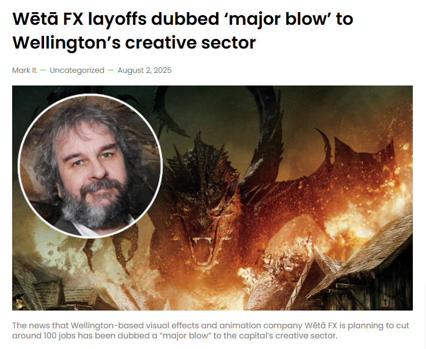 就在本月,全球知名的、总部位于惠灵顿的Wētā FX宣布计划裁撤约100个工作岗位。