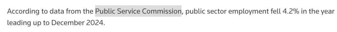 公共服务委员会Public Service Commission的数据显示,截至2024年12月的一年里,公共部门就业下降了4.2%。