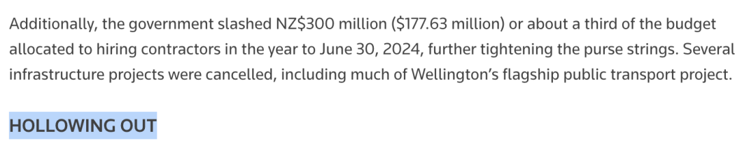 此外,新西兰政府在截至2024年6月30日的年度中削减了3亿纽币的合同支出预算,相当于削减了三分之一。