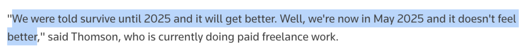 “我们被告知撑到2025年情况会好转。可现在是2025年5月,我并没有感觉好转,”目前靠自由职业维生的传播专员Rebecca Thomson说。
