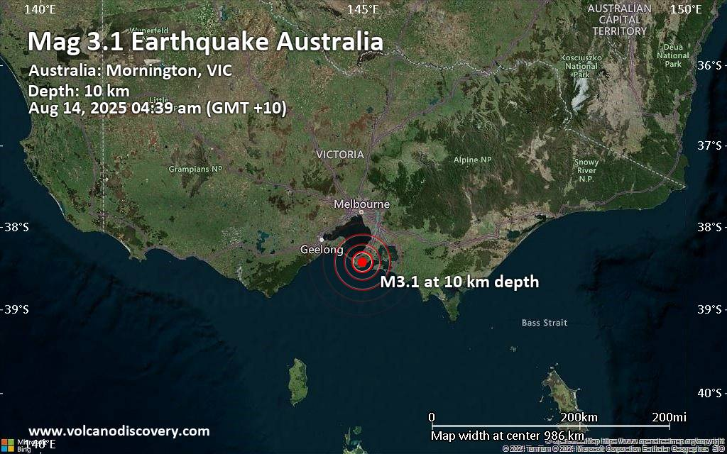 8月14日凌晨4点39分,维多利亚州Mornington Peninsula地区发生了一场3.2级地震,震中位于Main Ridge,震源深度约10公里。
