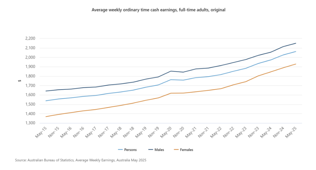 男性全职员工平均每周收入为2106.40澳元,女性为1864.10澳元,不过性别薪资差距已略微缩小,从11.9%降至11.5%。