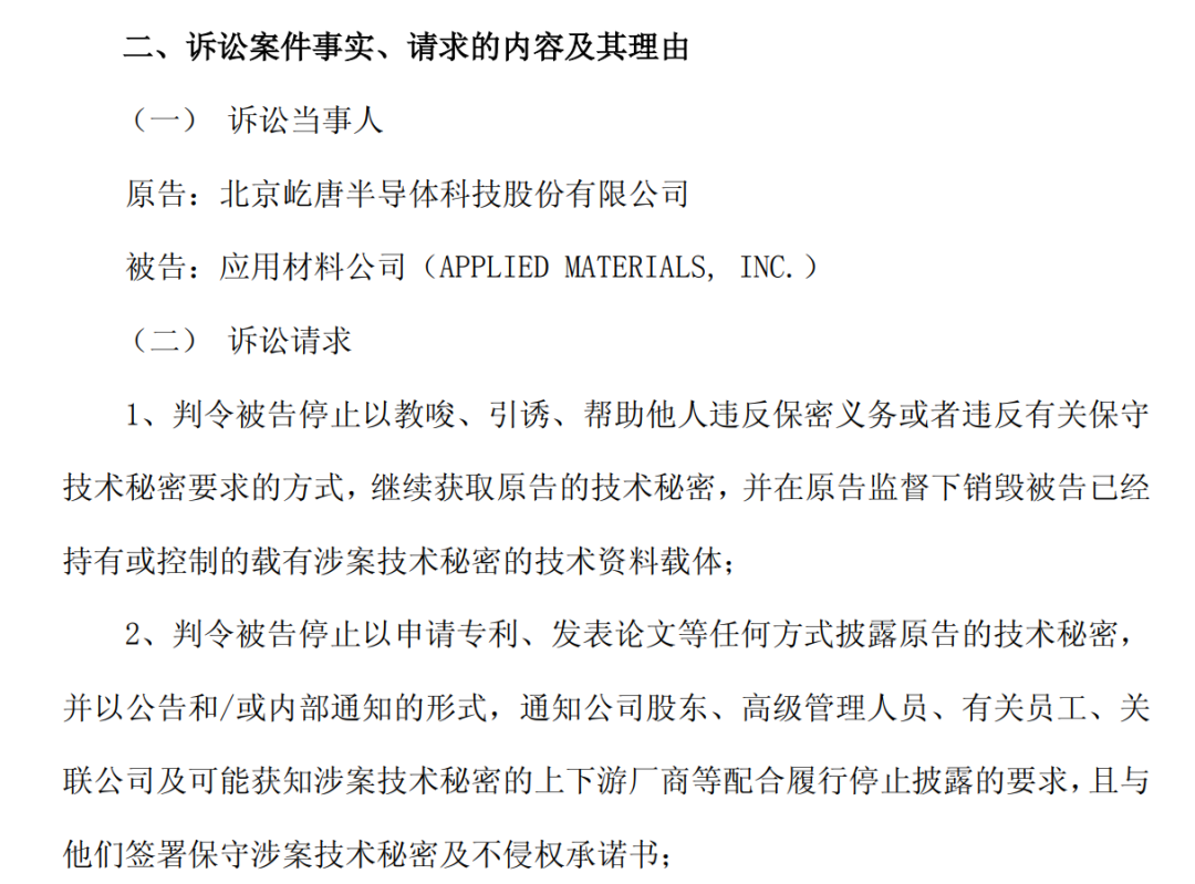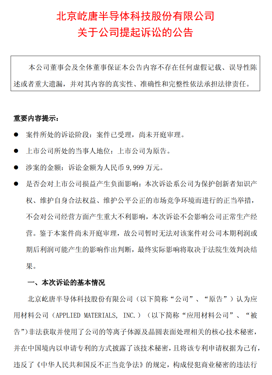 8月13日,国内半导体设备龙头北京屹唐半导体科技股份有限公司(以下简称“屹唐股份”)公告称,公司因认为应用材料公司(APPLIED MATERIALS, INC.)非法获取并使用了公司的等离子体源及晶圆表面处理相关的核心技术秘密,在中国境内以申请专利的方式披露了该技术秘密,且将该专利申请权据为己有,违反了《中华人民共和国反不正当竞争法》的规定,构成侵犯商业秘密的违法行为,向北京知识产权法院提起诉讼,诉讼金额为人民币9999万元。