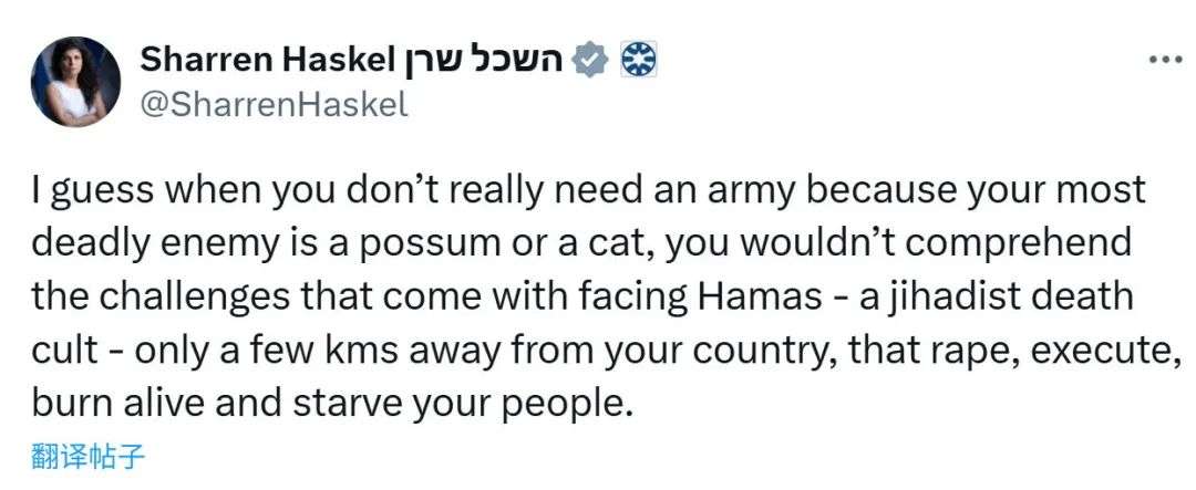 他的这番言论,引发以色列副外长Sharren Haskel今天在社交媒体上猛烈回击Luxon。