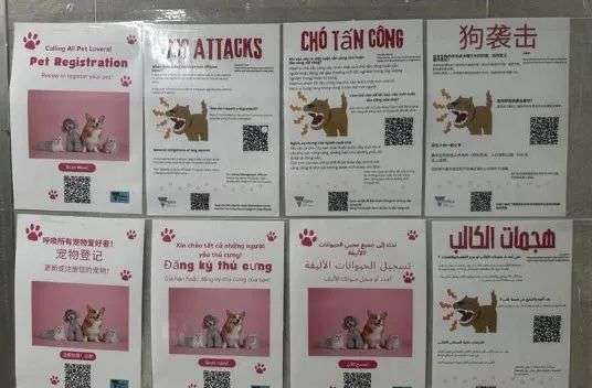 SBS普通话记者到访了Kai在Richmond一栋公屋里的家,电梯和走道中间张贴了多种语言版本的海报。 Source: SBS / Nicole Gong
