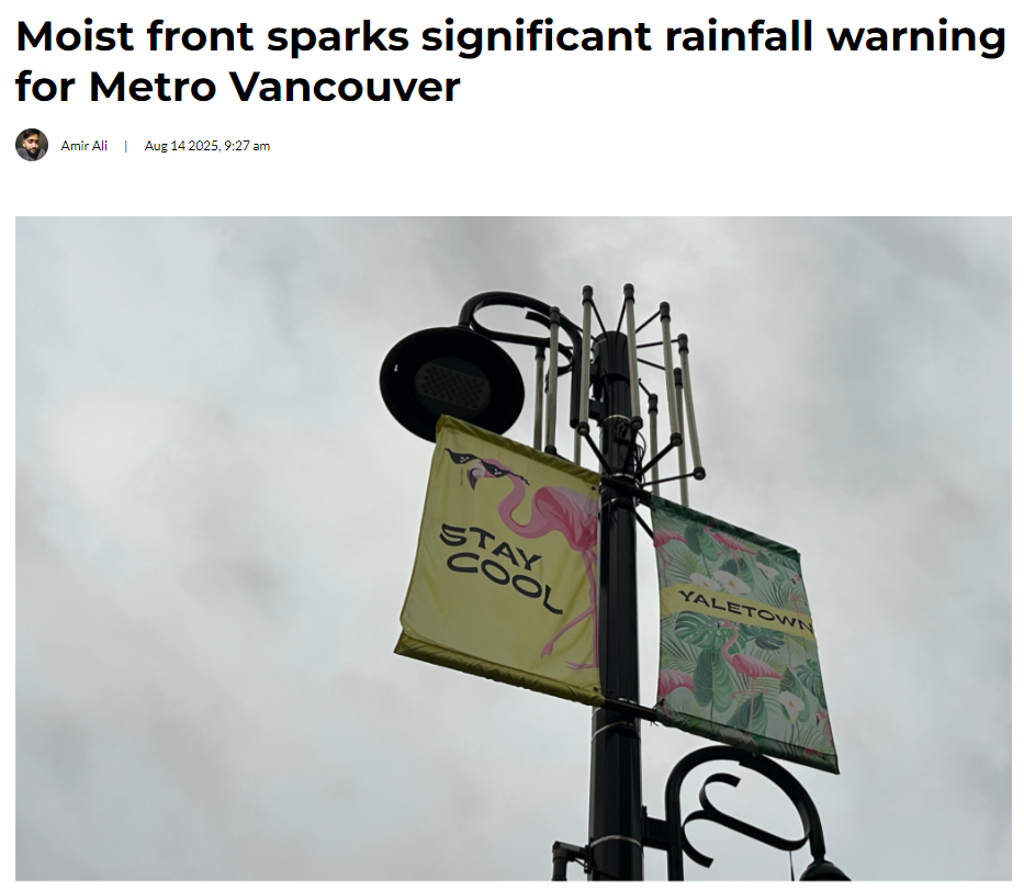 刚刚还在高温预警里“烤”得满城人找凉快,大温哥华地区这周末立刻就要切换到“入秋模式”。加拿大环境与气候变化部(ECCC)已发布暴雨预警,提醒市民周五将有一股异常潮湿的锋面系统横扫南海岸,带来强风与大到暴雨!