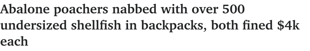 https://www.adelaidenow.com.au/news/south-australia/abalone-poachers-nabbed-with-over-500-undersized-shellfish-in-backpacks-both-fined-4k-each/news-story/e0c806e72a9ed1ff519a87b326b7d65f
