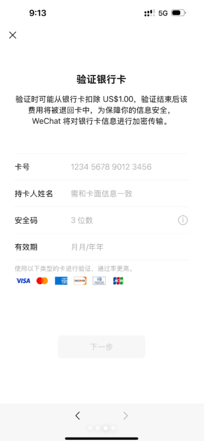 在选择“去验证”之后,页面显示“验证银行卡”选项,要求输入卡号、姓名和CVC安全码,并声称会扣除1美元完成验证。