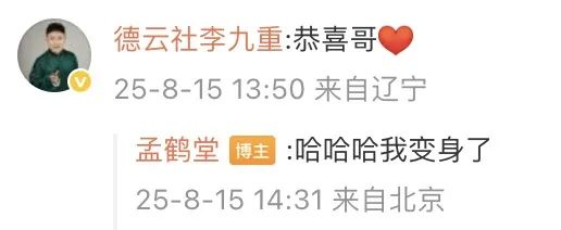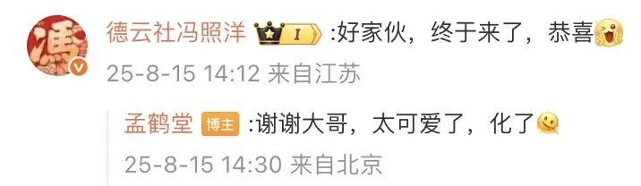德云社众星火速赶到评论区祝贺,李九重留言:“恭喜哥”,孟鹤堂回复:“哈哈哈我变身了”;冯照洋表示:“好家伙,终于来了,恭喜”,孟鹤堂则分享了初为人父的喜悦:“谢谢大哥,太可爱了,化了”。