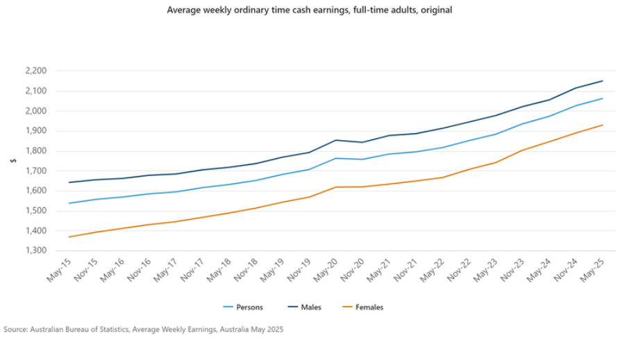 不过,数据也揭示了显著的性别差异:男性平均周薪为2106.40澳元,女性则为1864.10澳元,尽管性别薪酬差距从11.9%微降至11.5%,但结构性不平等依然存在。