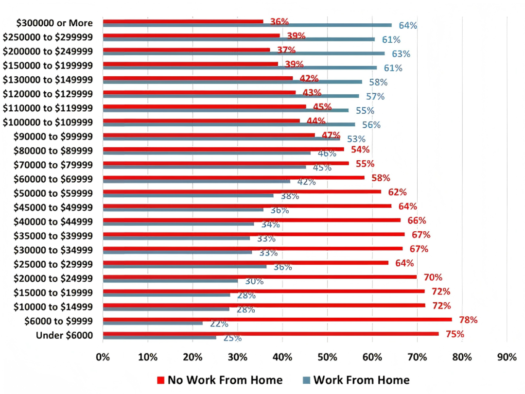 而除了不同地区、行业外,进一步的数据还揭示了收入水平与远程办公机会之间的紧密联系。