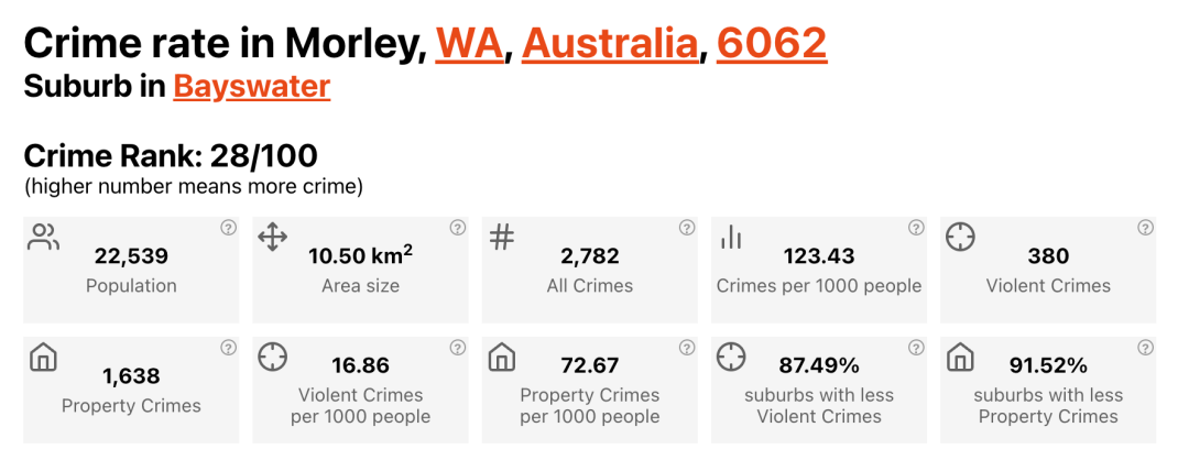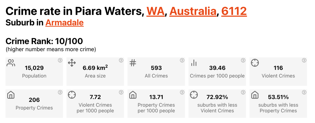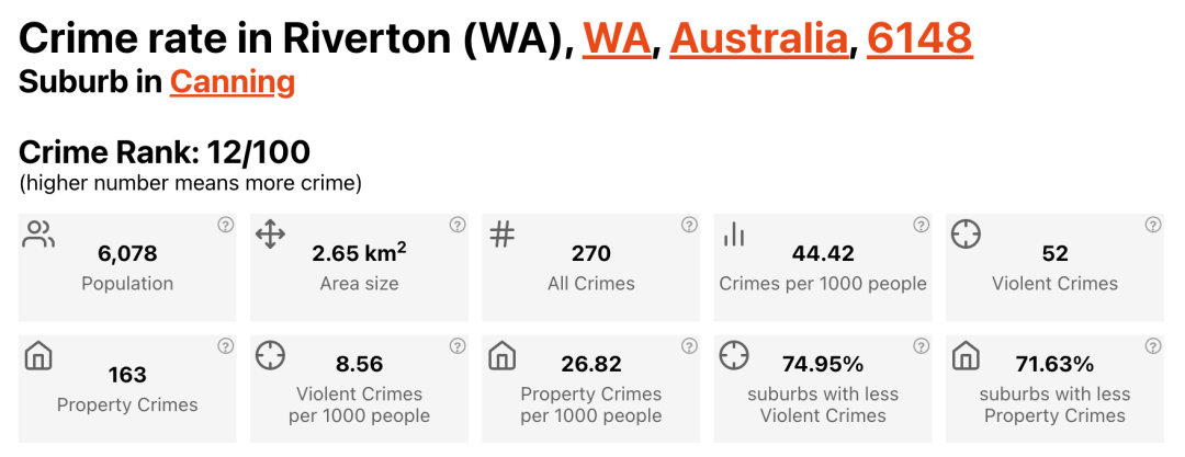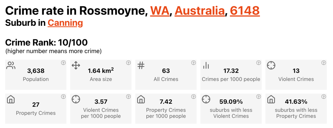 珀斯最大的华人区Willetton以及周边的Shelley、Rossmoyne、Riverton等,犯罪评分都为10左右,治安还是比较好的。