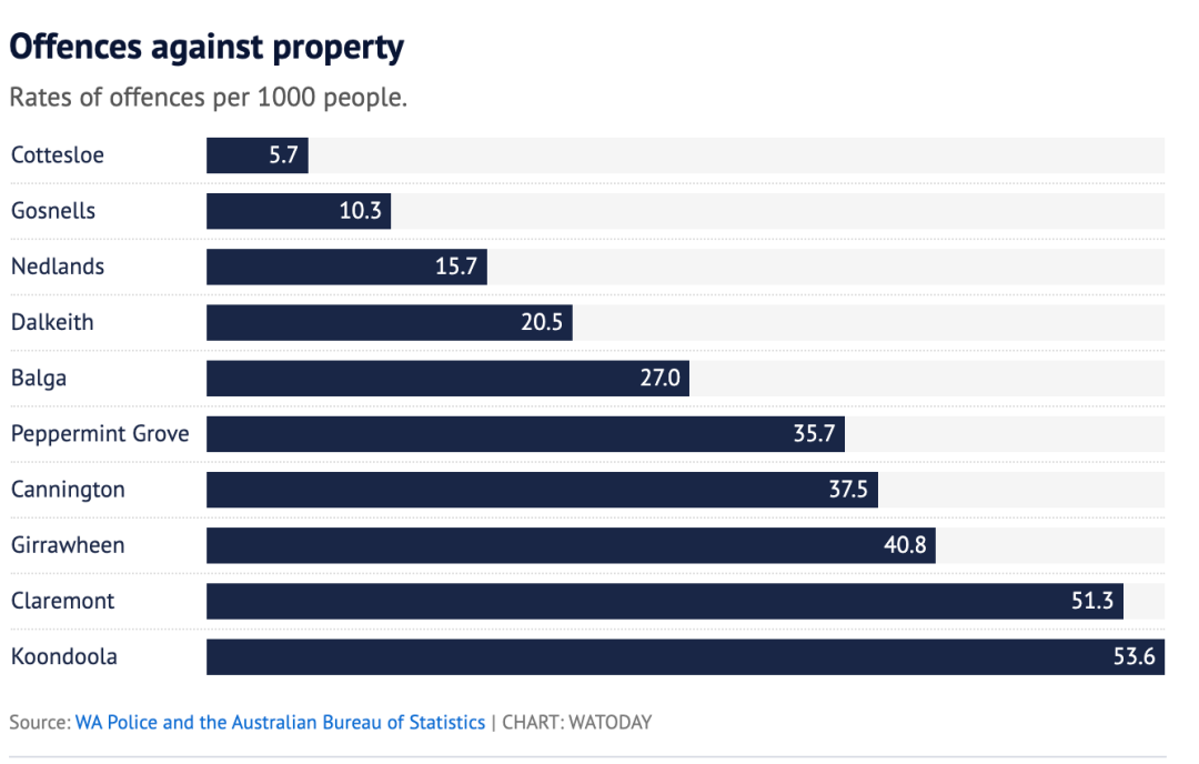 而Cottesloe——这里居住着矿业亿万富翁Andrew Forrest和前西澳州州长Colin Barnett等珀斯名流——在上个财政年度显示出最低的犯罪率。