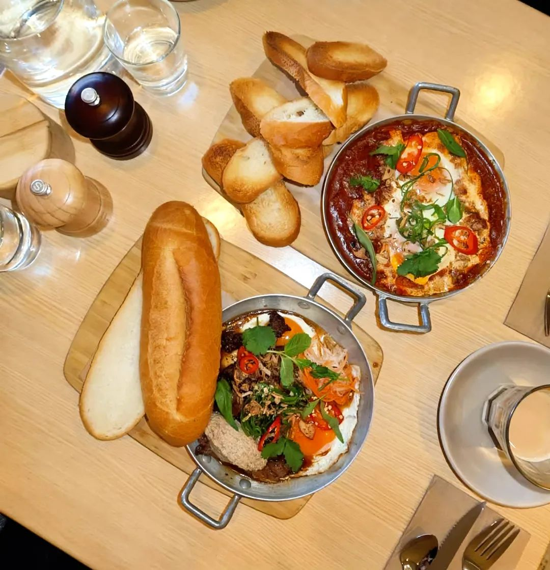 招牌菜不是传统的班尼迪克蛋,而是一锅热气腾腾的流心蛋,搭配肉酱、甜口的炒牛肉和腌菜,再用我们熟悉的法棍夹起来——立刻变成一种独一无二的“越南风味三明治”。