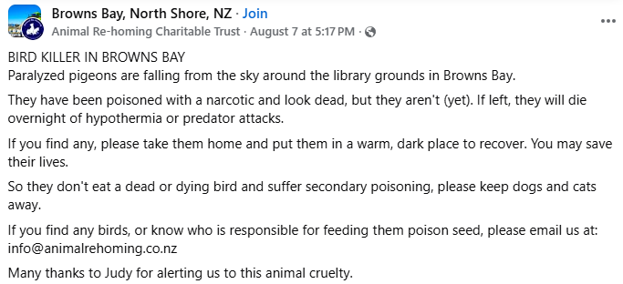 有北岸Browns Bay居民在社交媒体发帖称,发现成群的、麻痹的鸽子“从天而降”——他们怀疑有投毒者在暗中作案。