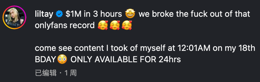 而就在刚满生日的第二天,Lil Tay就带着往常的乖张态度,在ins上对粉丝公开了自己“打破onlyfans最年轻和最赚钱性感模特”记录的好消息。