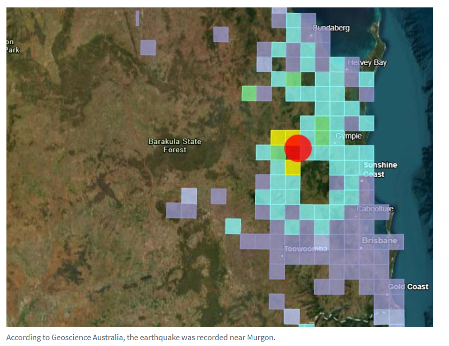 澳大利亚地球科学局报告称,震感地图的"震中"位于Murgon东部的Kilkivan。"震感地图"显示从Rockhampton到新州北部的Lismore都有震感报告。