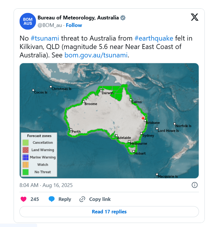 布里斯班、Moreton Bay、Toowoomba、Bundaberg乃至黄金海岸南部在内的各地居民均报告房屋震动。
