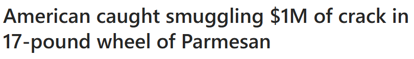 英国国家打击犯罪局(NCA)近日通报,一名来自美国加州的23岁亚裔女子崔洁米(Jamie Choi,译音),5月25日试图自秘鲁经多国转机抵达伦敦希斯洛机场时,将高纯度可卡因伪装藏匿在帕玛森乳酪中走私入境,当场被查获。涉案毒品市值约100万美元(约80万英镑)。她在法庭上当庭认罪,最终被判处五年三个月徒刑。